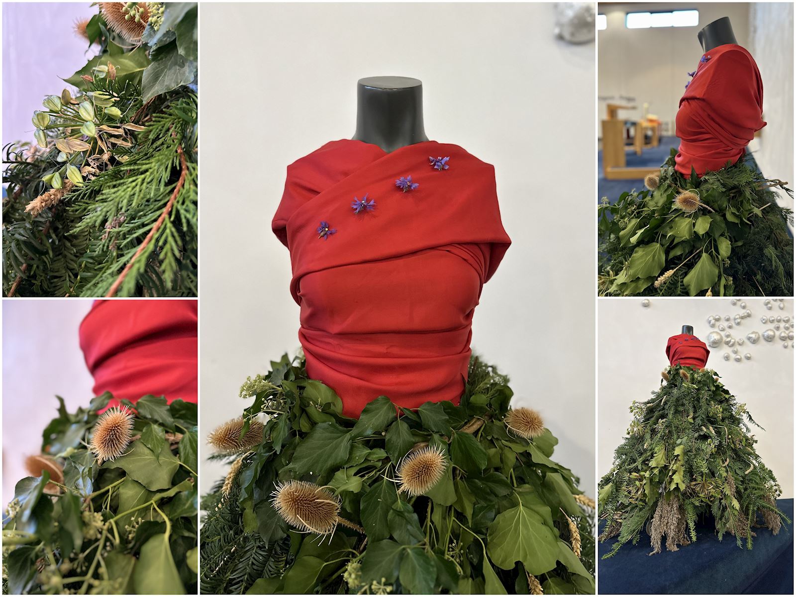 Voor de feestelijke gemeentezondag rond het thema Ruth is een levensgrote vrouwenfiguur gemaakt. Ze heeft geen gezicht, omdat ze aanvankelijk een onbekende ‘vreemdganger’ was. De groene rok is opgebouwd uit takken met prikkende naalden en gepunt eikenblad. De vrouw heeft in Moab veel verdriet en tegenslag gehad. Ook de scherpe kaardenbollen verwijzen naar haar pijnlijke verleden.