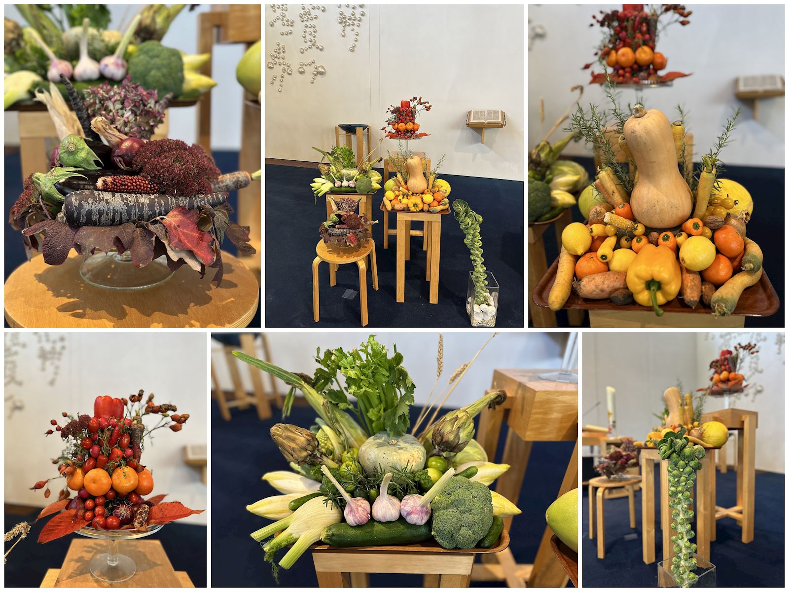 Kijk! Met een kleurige schikking laten wij onze dankbaarheid zien voor al de goede vruchten van het afgelopen jaar. Passend met bij het jaarthema ‘Kijk! Laat je verrassen door het werk van Gods Geest' kijken we met andere ogen naar vruchten en groente. Hoe fraai is de romanesco gevormd, hoe glanzend glad is een aubergine en hoe vrolijk zijn de gele tomaatjes. We hebben de oogst gerangschikt in vier kleurgroepen die de seizoenen symboliseren: een paarse winter, een groene lente, een oranje/gele zomer en een rode herfst. De stoere spruitenstok symboliseert onze wijkgemeente, want Carnisse Haven is gebouwd op land dat vroeger veel spruiten voortbracht. De kruiden-corsages van de voorganger en ambtsdragers verwijzen naar het paasfeest in de lente waarop we ook feestelijke corsages dragen. Nu het herfst is, kunnen we dankzeggen voor de rijke oogst van dit jaar.