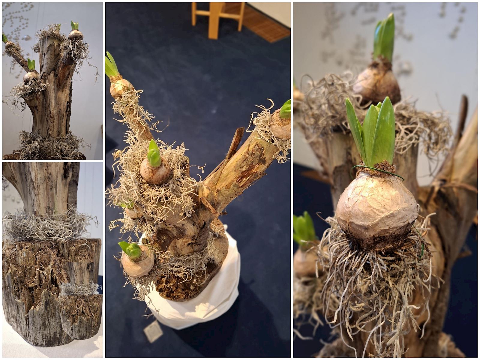 De schikking is geïnspireerd op een tekst van Stef Bos uit het lied Prediker. De bolletjes verbeelden de hoop en het verlangen naar het goede in het nieuwe jaar. De stam was deel van een stevige grote boom en alle bomen staan met elkaar in verbinding. De fragiele luchtige tillandsia herinnert ons aan de vluchtigheid en kwetsbaarheid van het leven.