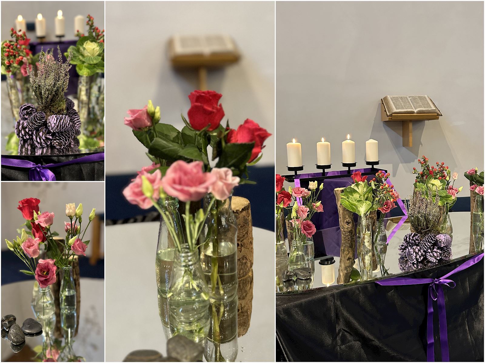 Vier kandelaars met kaarsen staan opgesteld. Drie kaarsen branden. Het donker is doorbroken, het donkerpaars verzacht, een lichtere kleur paars is zichtbaar. De heide, bessen en bloemen zijn roze, een glimp van wat komt. In ieder vaasje staan twee bloeiende rozen, want Lucas 1:39-56 vertelt dat Maria op bezoek gaat bij Elisabeth. Elisabeth herkent Maria als de moeder van de Heer, van Jezus. Ze zegt dat Maria gezegend is omdat ze gelooft dat God zal doen wat de engel haar verteld heeft. Dan dankt Maria God in een lied.